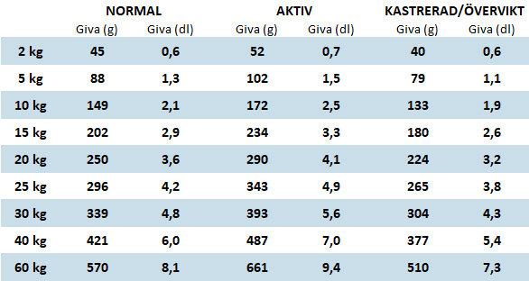 Precis som hos oss människor varierar energibehovet stort mellan olika hundar – även om de väger lika mycket och är lika aktiva. Därför är det viktigt att justera fodergivan individuellt för att din hund ska hålla en hälsosam vikt och må som bäst. Ett bra starttips när du byter till ORYGO är att minska den dagliga givan med 40–50 % jämfört med vad du tidigare gett. Utgå därifrån och anpassa mängden upp eller ner över tid – tills du hittar den perfekta balansen för just din hund.
